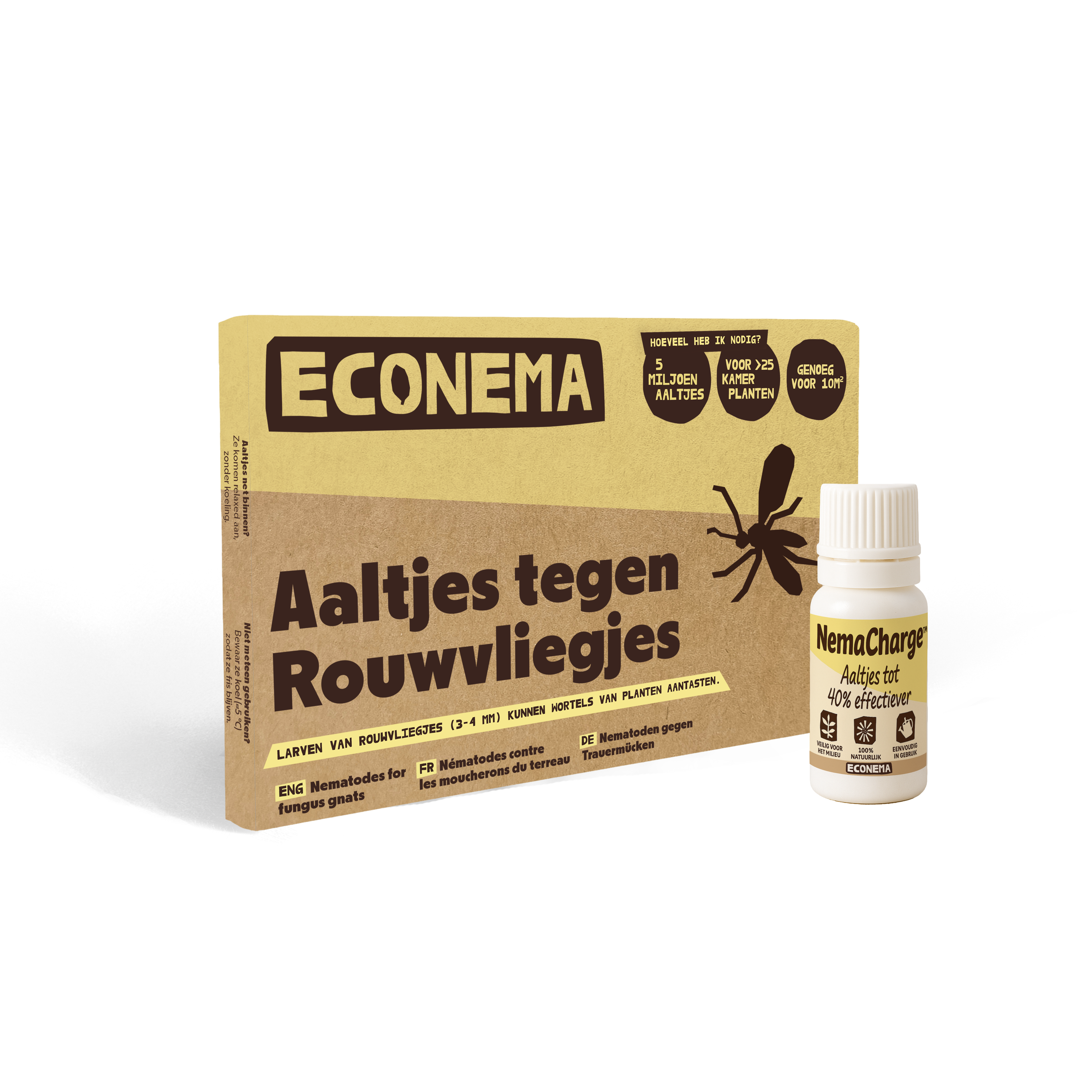Aaltjes zijn microscopisch kleine, levende organismen die van nature voorkomen in de bodem. Ze worden al jarenlang ingezet als biologische oplossing tegen plaaginsecten bij planten. De aaltjes van Econema dringen de larven van schadelijke insecten binnen en schakelen deze van binnenuit uit. Voor mensen, huisdieren en planten zijn aaltjes volledig veilig.